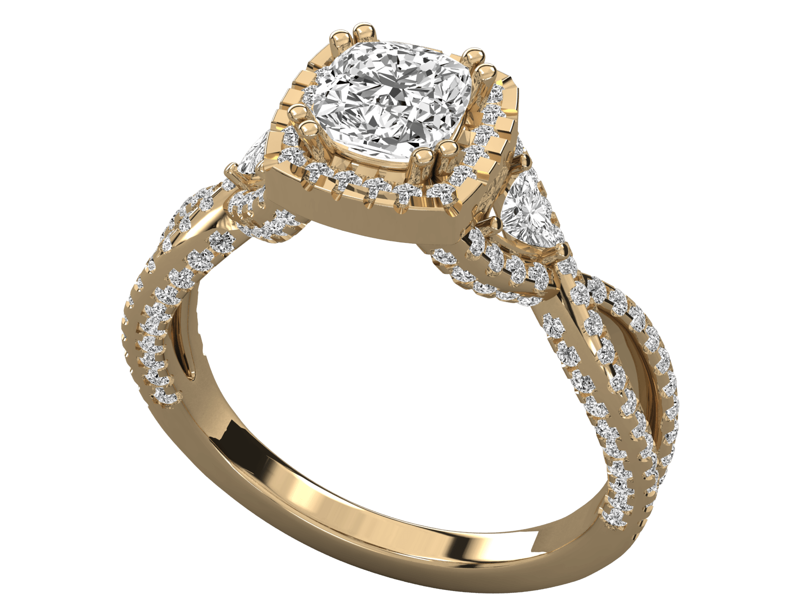 Elegant and eye-catching, the Aurora Halo Twist Ring features a stunning 0.83 carat of dazzling diamonds, thoughtfully set across 35 stones. At its heart lies a captivating round-cut center stone, encircled by a delicate halo and flanked by pear-shaped diamonds on either side—adding extra brilliance and charm. The gracefully twisted band is paved with shimmering diamonds, adding dimension and a luxurious finish. Crafted in rich yellow gold, this piece embodies timeless beauty with a modern flair, making it a perfect choice for engagements or a statement of love. Also available in rose gold & platinum upon request.