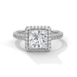 Bold. Brilliant. Timeless. The Celeste Princess Halo Ring features a dazzling 7×7 mm princess-cut center diamond (approx. 2.00 ct), encircled by a sparkling halo and pavĂ© band of 46 round diamonds totaling 0.57 ct. The perfect fusion of elegance and grandeur.