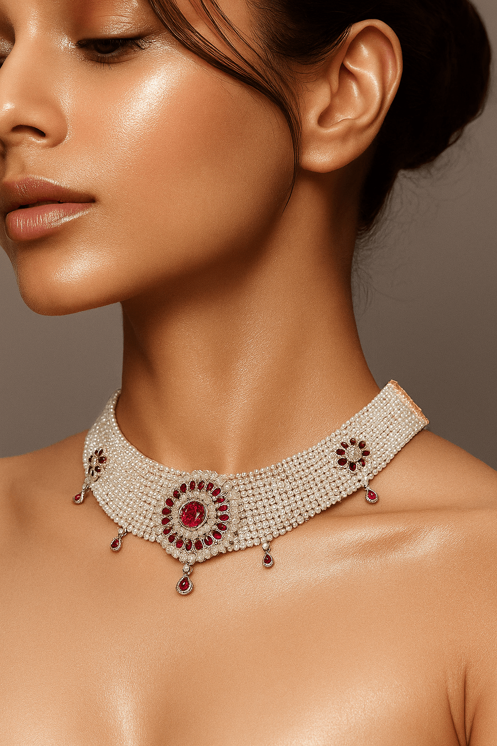 Crafted with a traditional aesthetic and modern elegance, this handcrafted choker stands out with its triple floral centerpiece. The base is made of tightly woven white imitation beads, creating a soft yet bold choker band. At its heart are three beautifully detailed flower-shaped motifs in silver-toned metal, each set with a dazzling combination of deep red and shimmering white stones (non-precious). The central motif is larger, highlighting the neckline, while the two flanking pieces create perfect symmetry and balance. Tiny dangling elements enhance the richness of the design. Finished with classic golden thread ties, this necklace is a timeless pick for weddings, festive occasions, or traditional functions.