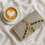 Elevate your style with this luxuriously handcrafted Silver Clutch, an embodiment of heritage artistry and timeless elegance. Made from pure silver, the bag features intricate floral filigree patterns that showcase masterful craftsmanship. The front is adorned with ornate gold-toned accents, delicate rose motifs, and a regal arrangement of emerald-green stones framed by shimmering crystals. A statement pendant with pearl detailing adds a touch of royal charm, making this clutch a perfect companion for weddings, festive occasions, and grand soirées.