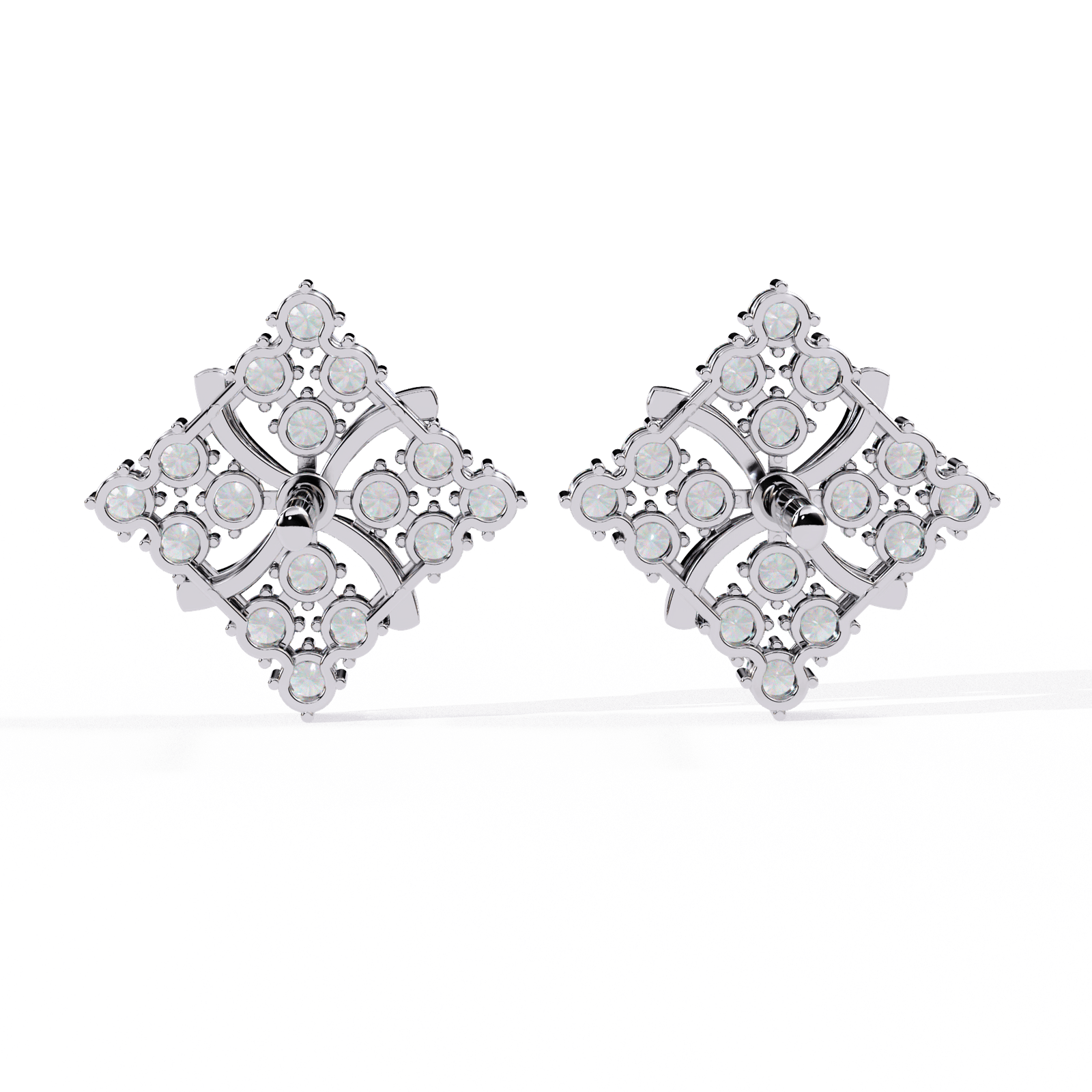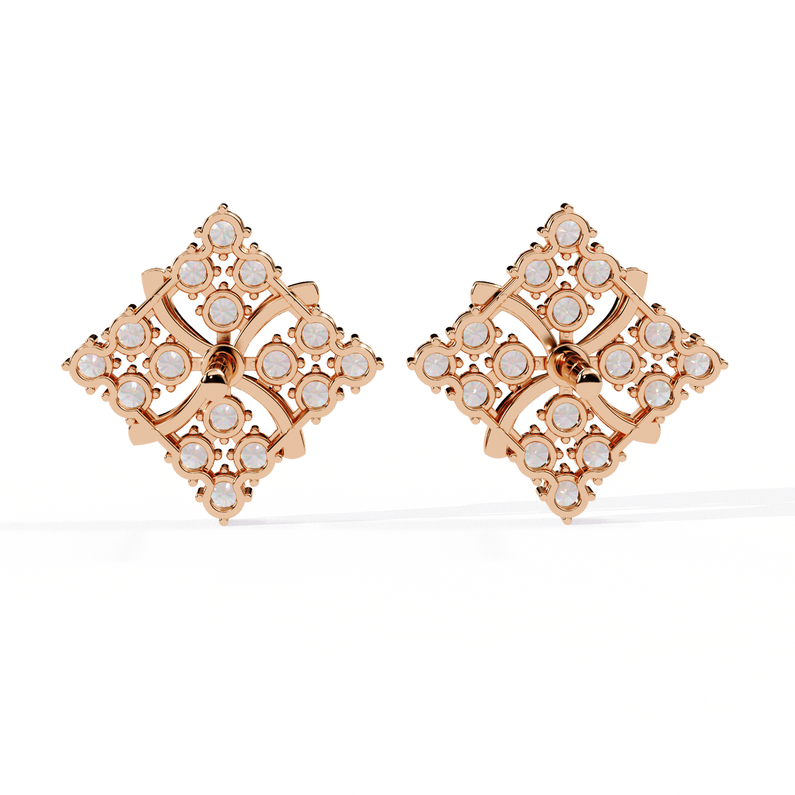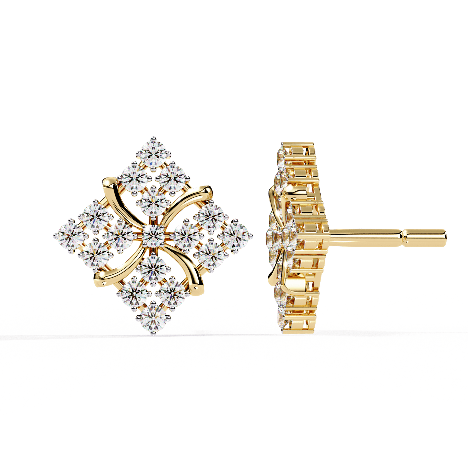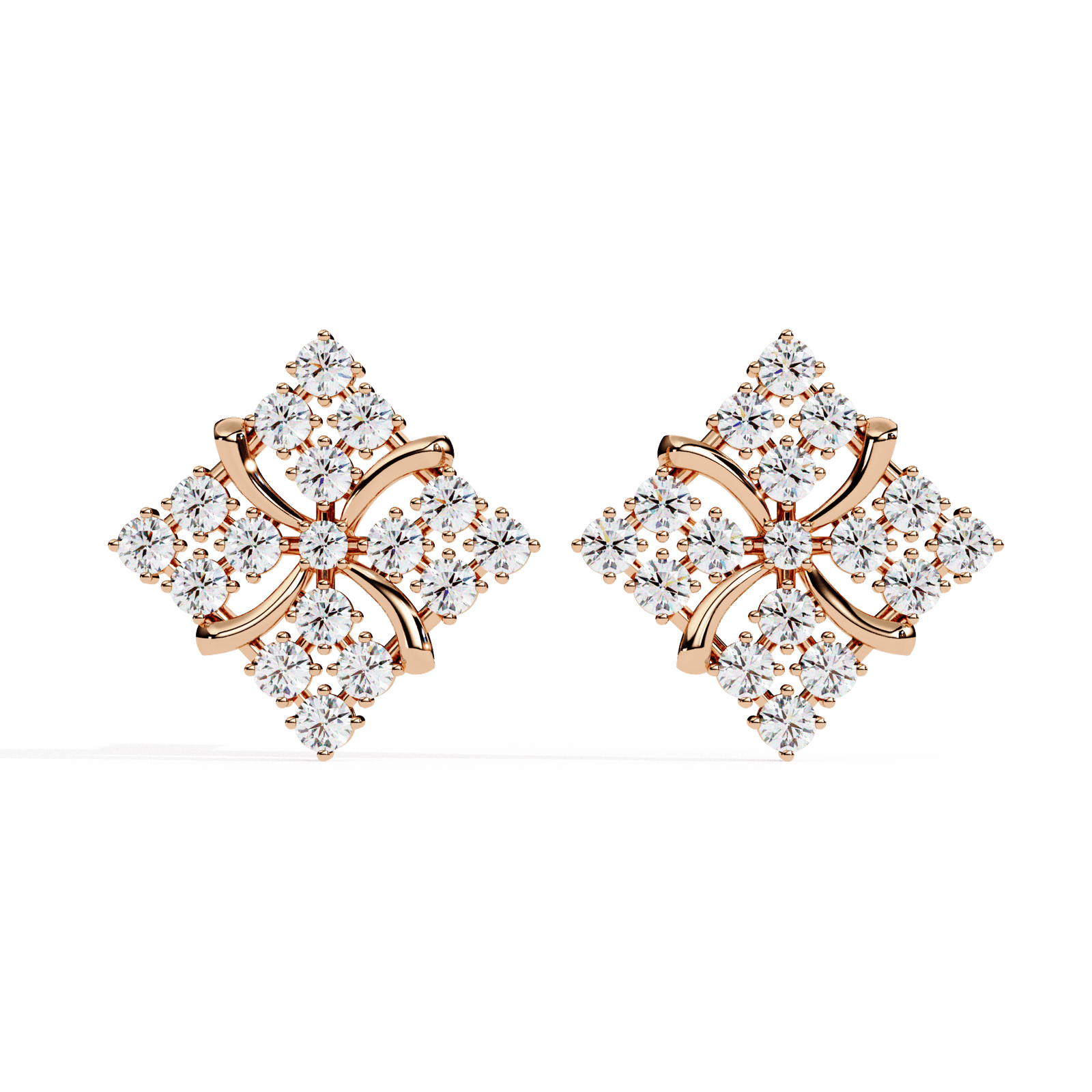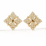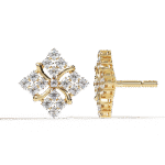 These exquisite square floral diamond studs blend intricate craftsmanship with radiant brilliance. Adorned with 0.77 carats of sparkling diamonds, they are set in a luxurious framework weighing 3.09 grams of gold. The elegant petal-like curves at the center enhance the symmetrical sparkle, making them perfect for both everyday grace and special occasions. Available in your choice of Gold, Rose Gold, or Platinum to suit your personal style.