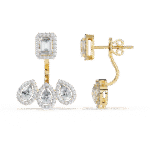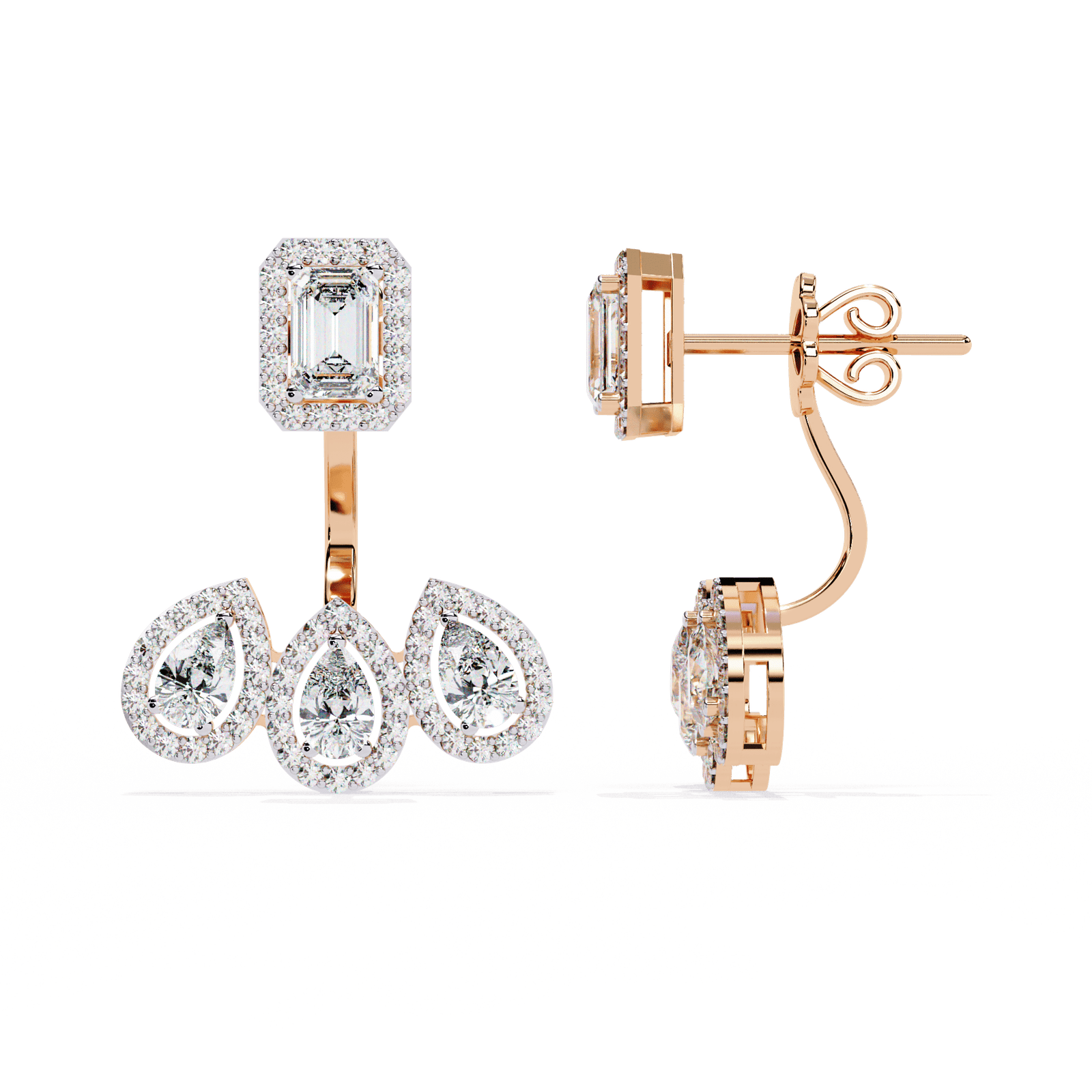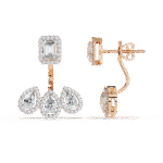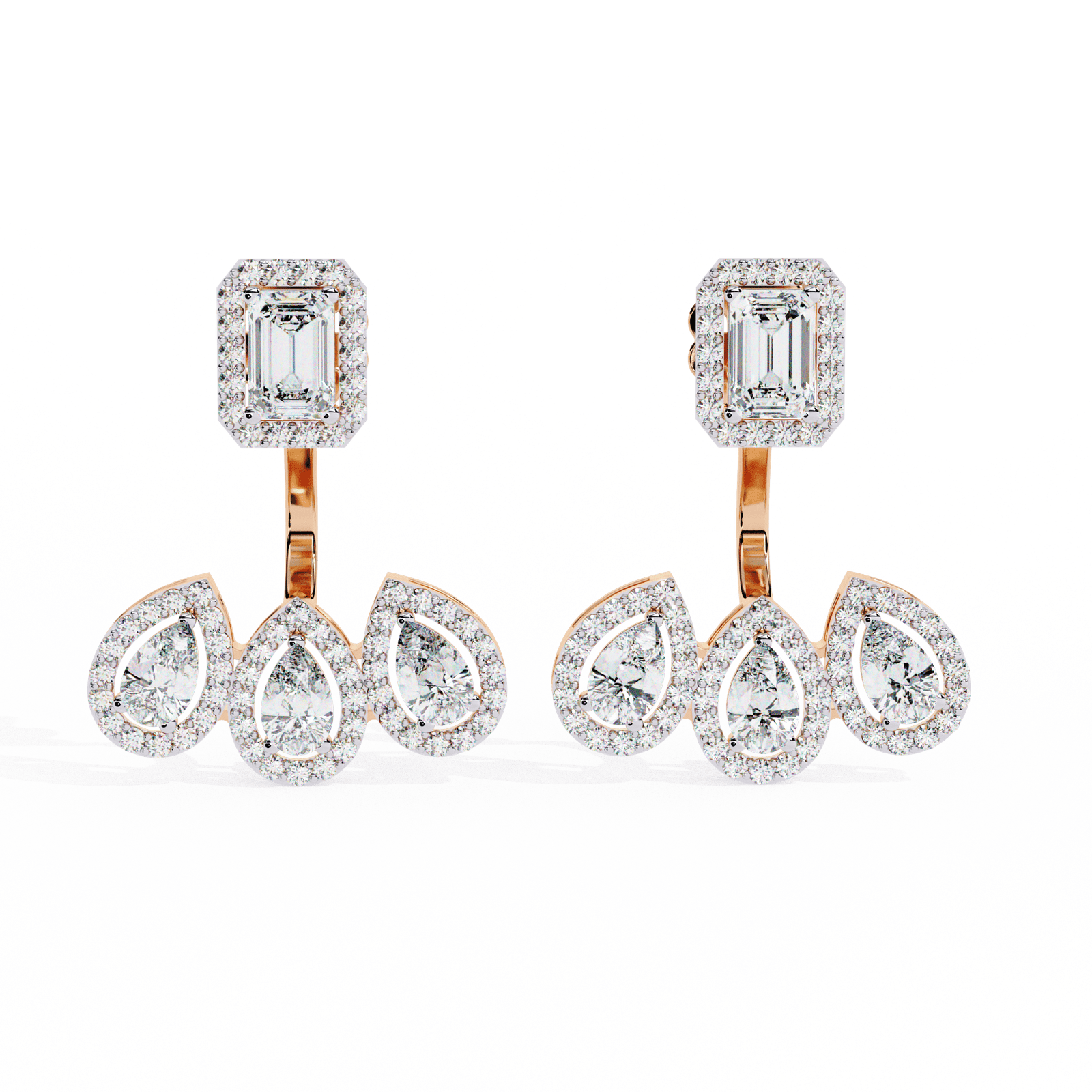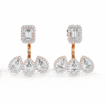 Step into the spotlight with these breath-taking earrings that radiate royal charm and sophistication. Featuring a commanding emerald-cut diamond centerpiece, framed in a halo of pave brilliance, this design flows into a graceful trio of teardrop diamonds—each one sparkling with refined elegance. With a total diamond weight of 3.6 carats and a bold presence at 7.43 grams, these earrings are a masterpiece of balance and beauty. Available in your choice of gold or rose gold, they’re perfect for grand occasions or when only the most dazzling statement will do.